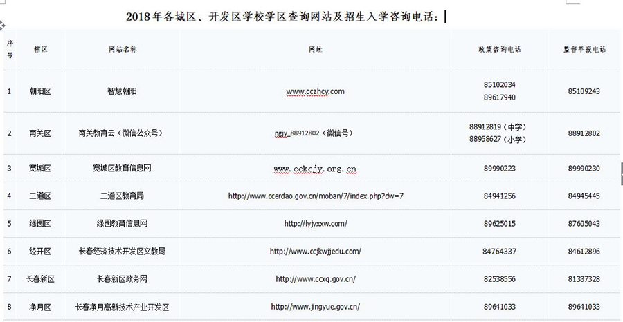 长春各城区、开发区学校学区查询网站及招生入学咨询电话。 长春市教育局 供图