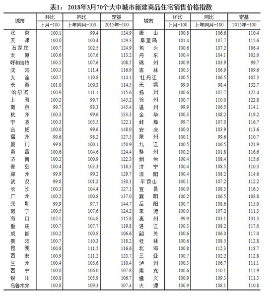 2018年3月,70个大中城市新建商品住宅销售价格指数。 来源:国家统计局网站