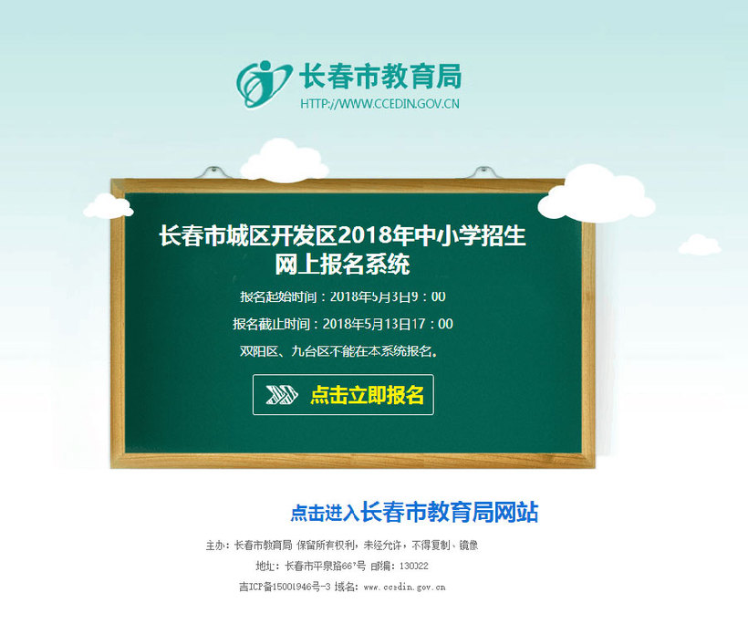 第一步,打开欢迎网页。在任何地方,只要打开电脑或手机,登录“长春市教育局网站”(网址:www.ccedin.gov.cn)就会看到“长春市城区开发区2018年中小学招生网上报名系统”的欢迎网页,点击“立即点击报名”图标,进入报名系统。如图: