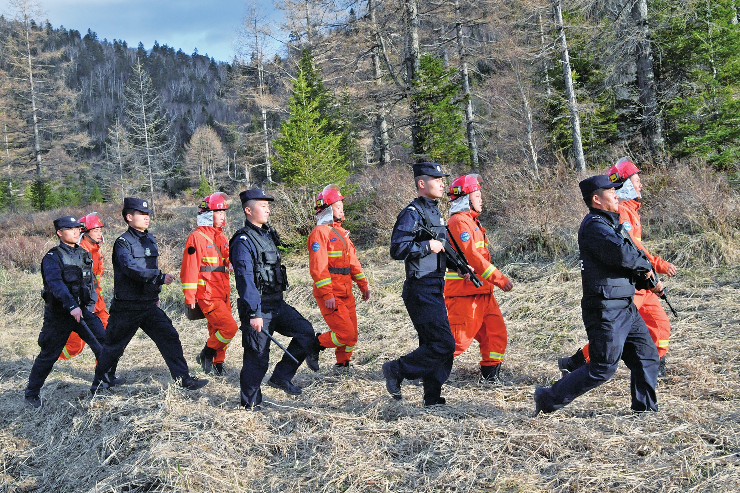 长白山自然保护管理中心防火处处长李树学带队在森林中巡查。