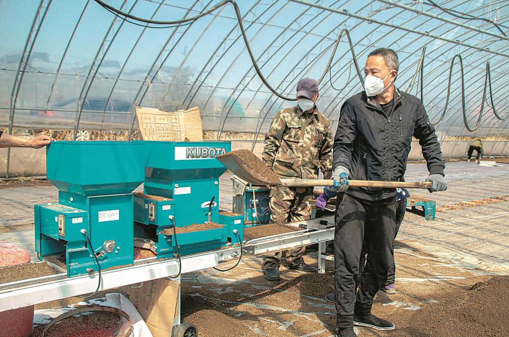 红光村农民在为水稻秧苗育秧机加土。 摄影 吉林日报记者 张野