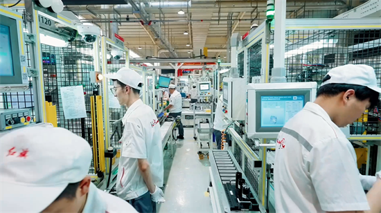 智能产线上,机械臂精准舞动,AGV小车沿预定轨迹无声穿梭,一台台新能源汽车电驱在生产线自动完成装配。