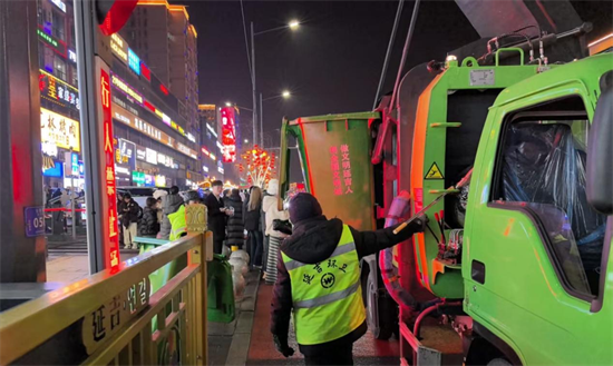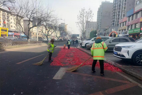 天刚蒙蒙亮,延吉的街头渐渐有了行人。在车流渐密的主干道,清运车辆缓缓停靠,环卫工人默契配合,将一袋袋垃圾搬上车;在热闹的商圈,身着荧光绿的身影穿梭在游客之间,及时清理散落的杂物;在老旧小区的巷弄里,两名环卫工人正合力清扫成片的烟花爆竹碎屑,红色的碎屑在扫帚下汇聚,宛如铺在地上的“红地毯”。