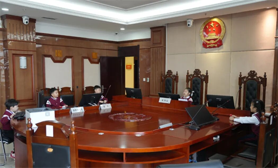 紧接着,孩子们走进专门为保护未成年人权益设置的数字化圆桌法庭。在法官带领下,小朋友们化身“法官”“书记员”“原告”“被告”“证人”,围绕一个“小熊购买到假冒伪劣糖果”的虚拟案件展开一场沉浸式模拟庭审”。