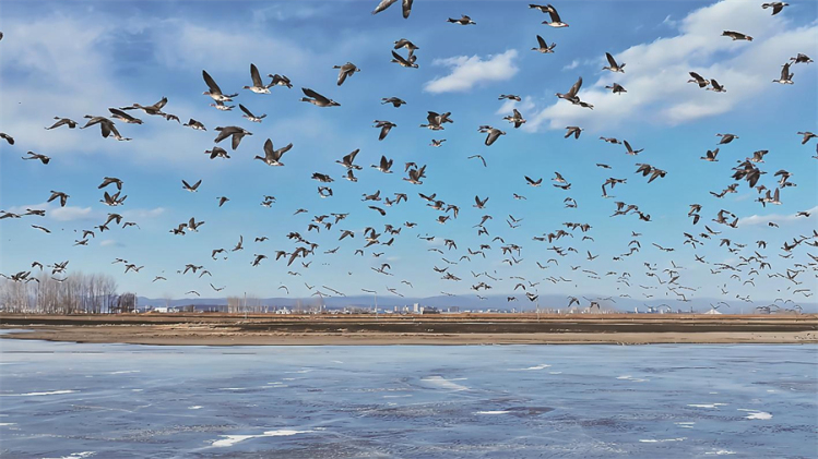 3月的珲春,春潮涌动,冰雪消融,再次迎来候鸟北归高峰,数十万只大雁结伴而至,奏响了珲春早春最动人的生态序曲。